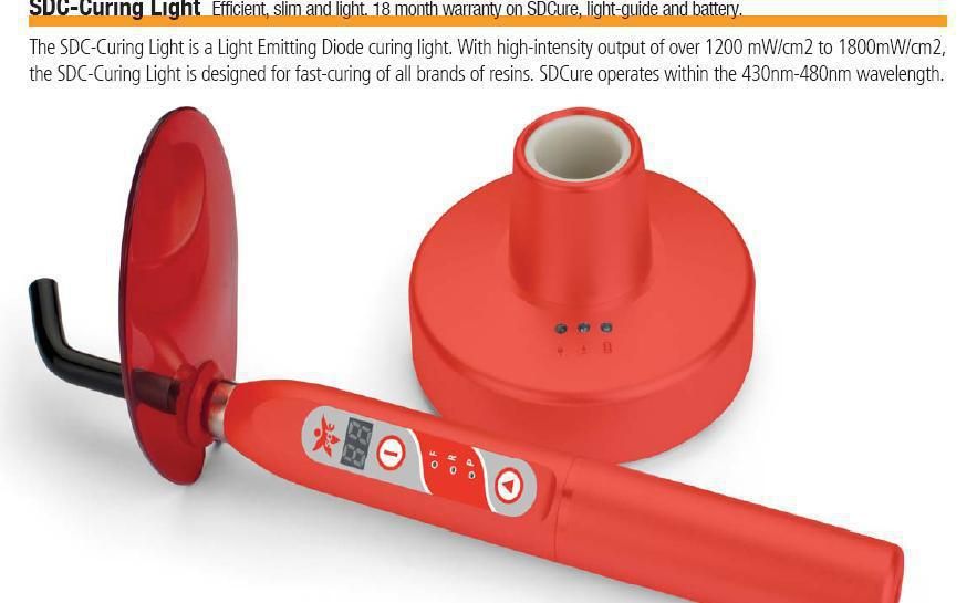 Lámpara de foto curado de luz de Diodo. Incorpora una salida de luz de alta intensidad de 1200MW/cm2 hasta 1800MW/cm2. Ha sido diseñada para polimerizar de forma rápida todas las marca de resinas. Opera con una longitud de onda de 430nm a 480nm. Ventajas: Eficiente, fina y ligera. Inalámbrica. Salida de alta intensidad. 3 programas (5segundos, 10 segundos, 20segundos) Recuerda el tiempo seleccionado. Modo de pulsación Batería de ion litio de calidad premium (sin efecto memoria) Más de 500 polimerizaciones de 20 segundos con la bacteria plenamente cargada Guía de luz curva de 8mm incluida. a