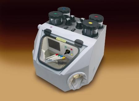 Máquina chorreadora de arena de la gama alta. Cuenta con cuatro vasos cada uno de ellos con un manorregulador y un manómetro independientes, con lo que se consigue gran precisión en los trabajos de arenado fino. Por su parte, un sistema de calentamiento instalado en cada uno de los vasos se encarga de mantener la arena libre de humedad evitando la aparición de grumos que atasquen las boquillas.