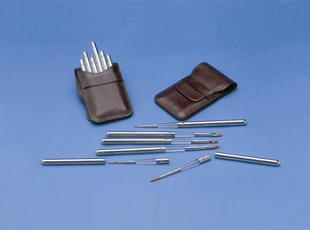 Surtido de seis pinceles de alta calidad fabricados con pelo de Marta Kolinsky. Cada pincel dispone de una capucha protectora que mantiene la humedad y lo preserva de la suciedad. El conjunto incluye los pinceles más usuales en laboratorio dental (Redondos Nº 0, 2, 4, 6; y Planos Nº 2 y 4). El set se suministra junto con un práctico estuche.